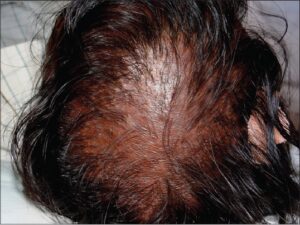 • Vùng tóc trên trán bị mất dần và không mọc lại theo thời gian