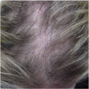 Biểu hiện là rụng tóc loang lổ với vảy và ban đỏ. Phần rụng tóc có thể đơn lẻ hoặc nhiều mảng. Các vết sẹo lớn do di chứng cũng là một nguyên ngân ngăn cản sự phát triển của tóc.